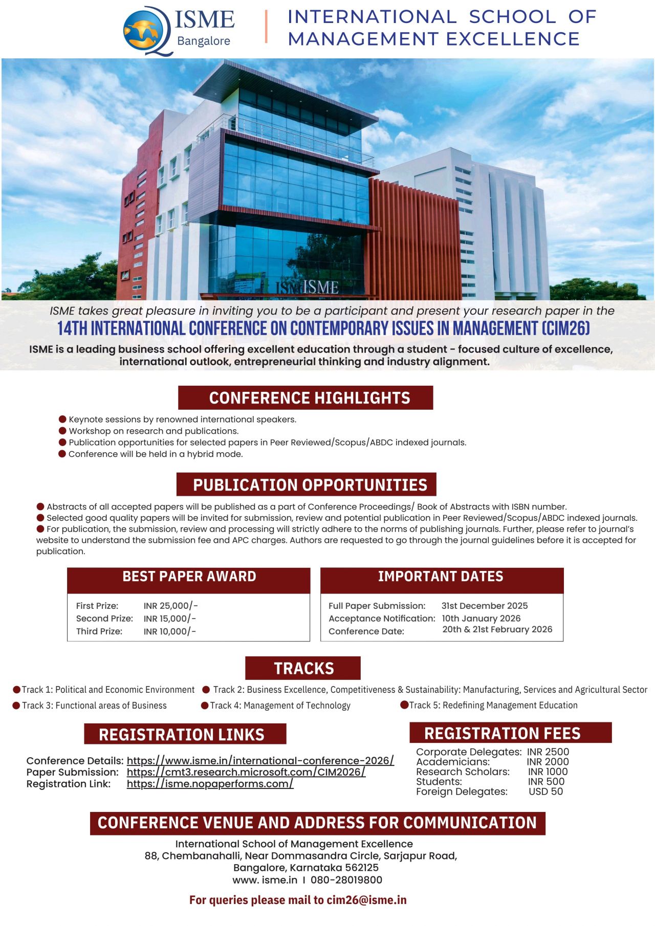 | | |  | At the 18th International Accreditation Conference held on November 14 & 15, 2025 at Indus Business Academy (IBA), Bengaluru, Dr. Rony G. Kurien, Dean of ISME, shared impactful insights during the Deans/Directors & Academic Leaders Panel Discussion. | | |