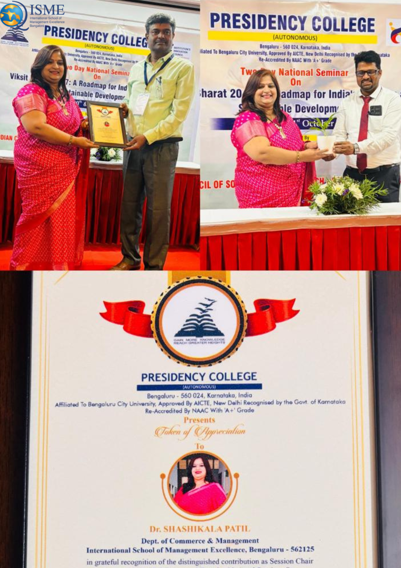 | Dr. Shashikala Patil was invited as a Session Chair at the ICSSR-SRC Sponsored Two-Day National Seminar on “Viksit Bharat 2047: A Roadmap for India’s Inclusive and Sustainable Development,” held on 30th and 31st October 2025 at Presidency College, Bengaluru. | | |