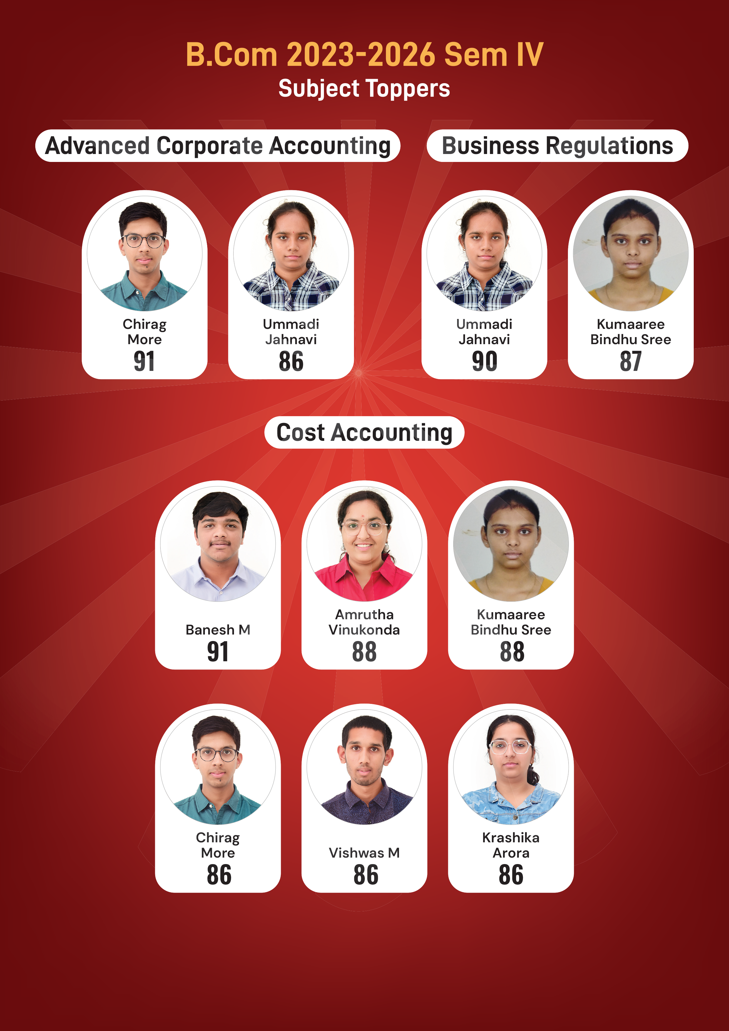 The curriculum framework and content of this course will facilitate students to conveniently pursue a career in International Finance and Accountancy. The course enables the students to obtain substantial fundamental knowledge of subjects like Accounting, Taxation, Law, Financial Reporting, Auditing, Risk Management, Corporate Governance, Management Accounting, Finance and Business Ethics. The B.Com course is challenging and yet very rewarding to students with high career aspirations. The core subjects will be taught by experienced faculty and professionals from the industry.