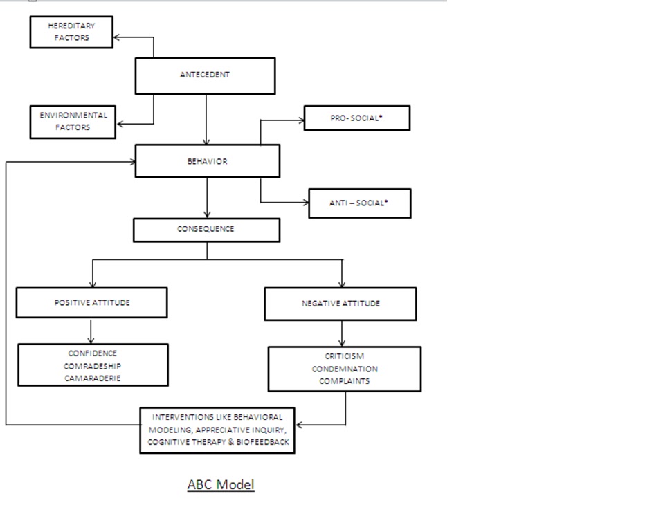 The ABC model refers to the Antecedent, Behaviour and Consequences that is primarily responsible for attitude formation. The antecedent’s stems from two factors: one is the hereditary factors, whatever has been inherited through the genes and the secondary factor is the external environment. The environment can be one’s exposure to the values, belief system, companions influence, schooling, upbringing etc. This is called the Bandura’s “Social Learning “. Individuals observe their role models and follow their footsteps thus creating an Attitude.