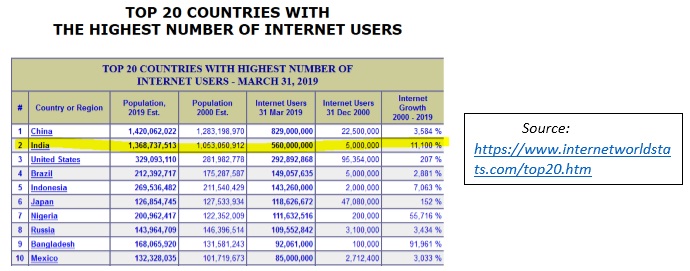 India has been exhibiting phenomenal growth in internet usage to position itself at the second place worldwide after China in terms of number of internet users.