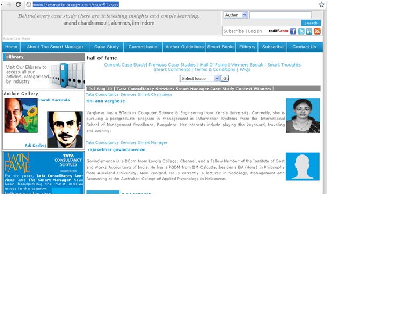 Rini Verghese, a student of ISME won an online case study contest conducted by Smart Manager Magazine, sponsored by Tata Consultancy Services. The contest calls in entries for analysis of a case study. Rini won the prize in the Student Case Study category. ISME congratulates Rini for her great success.(http://www.thesmartmanager.com/issue51.aspx)