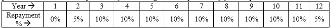 8. Firm’s decision is to use maximum debt financing. Over and above debt financing, if there is a requirement for equity, the firm will raise equity financing in Vietnam. The firm’s banker has agreed to fund the project upto a maximum of € 200 million as Senior Facility. The applicable interest rate throughout the project’s life is 5% p.a. The same needs to be repaid in 10 years starting after two preliminary years as per the below schedule: