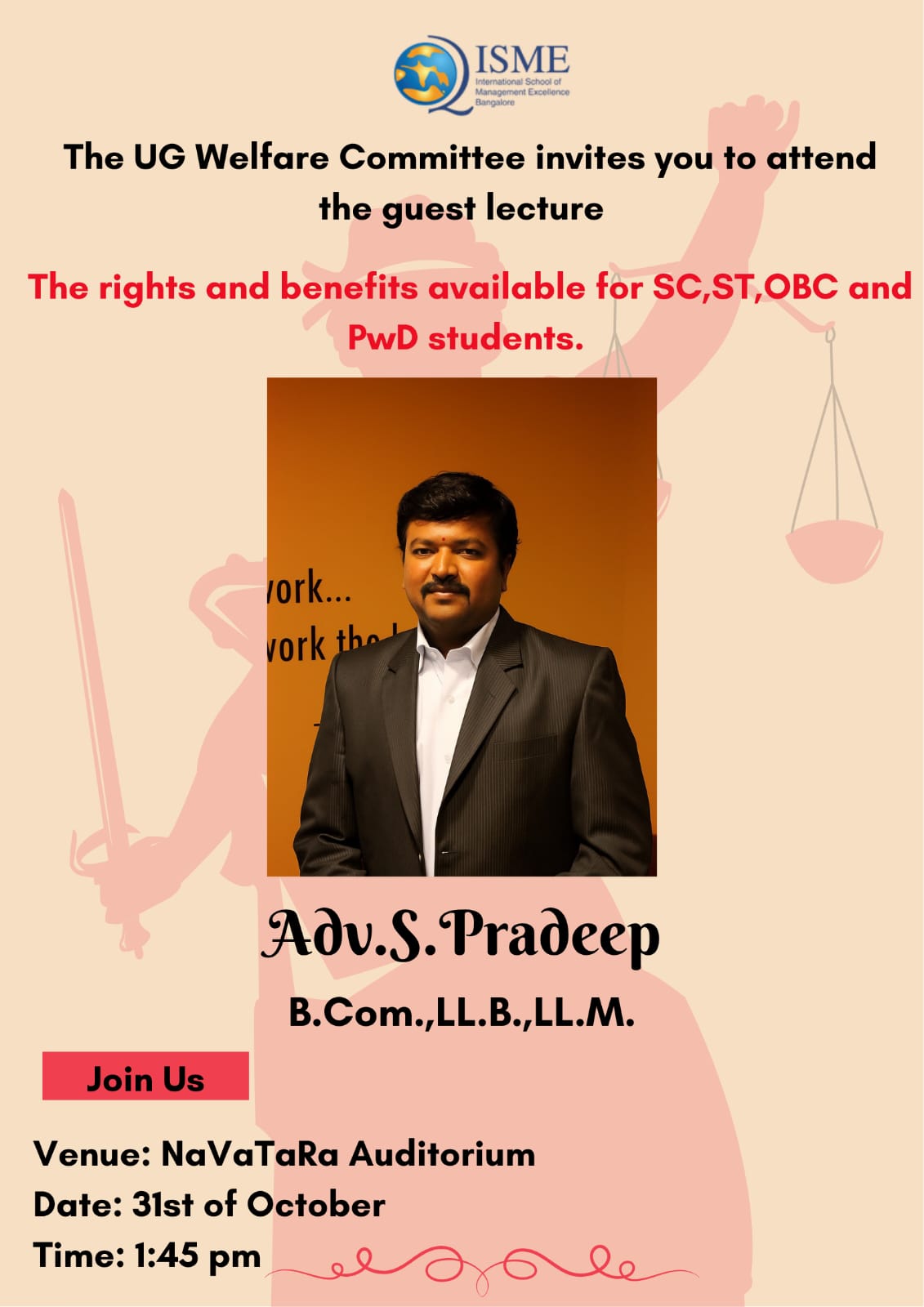 - Guest Lecture on the Rights and Benefits available for SC, ST, OBC and PWD students