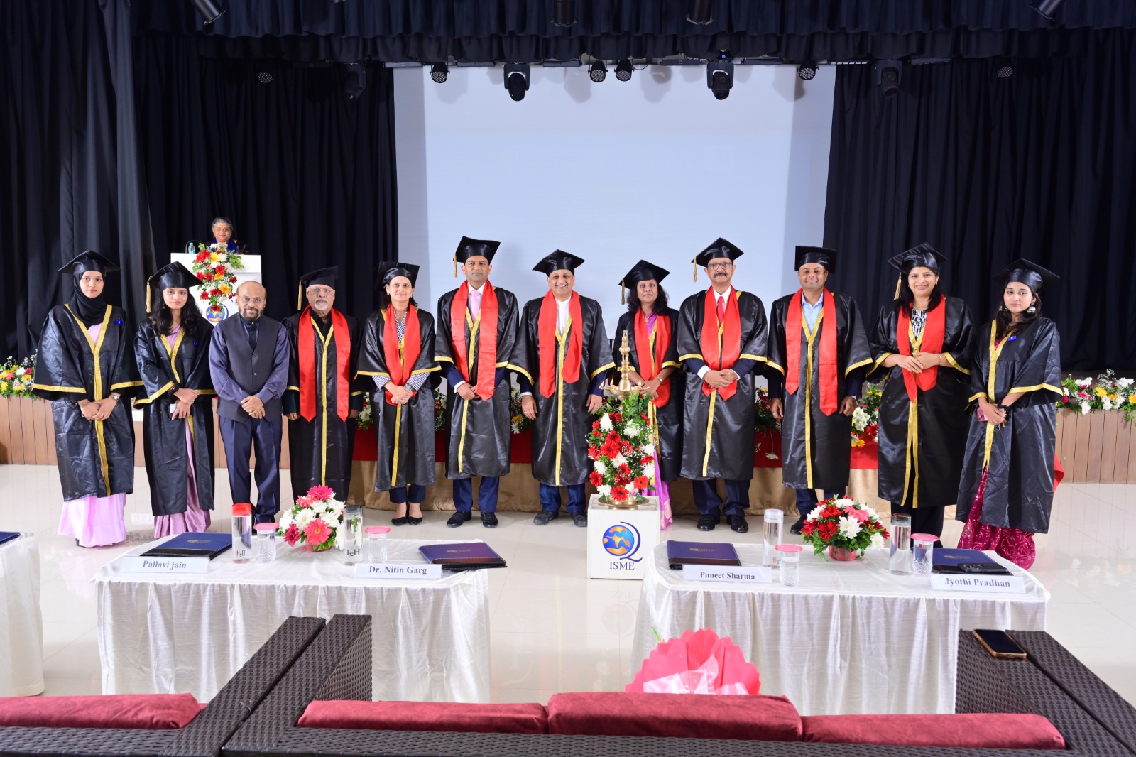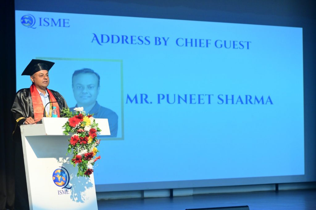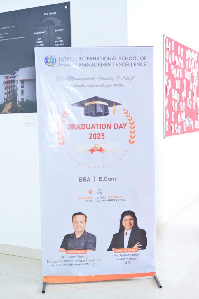 The International School of Management Excellence (ISME), Bangalore, held its Graduation Day 2025 on Saturday, 27th September, at the on-campus NaVaTara Auditorium. The ceremony celebrated the achievements of BBA and B.Com graduates, with a warm welcome extended by the management, faculty, and staff. Mr. Puneet Sharma, Managing Director and Global Head of AI, Asset & Wealth Management at JP Morgan, served as Chief Guest, and Ms. Jyothi Pradhan, ISME Board Member, as Guest of Honor. Centered on the theme of celebrating academic milestones, the event featured symbolic visuals of a graduation cap, laurel wreath, and scroll. The occasion underscored ISME’s ongoing commitment to academic excellence and student success.
